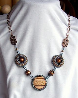 I will tell you that this is the first time I have bezeled with delicas and I love it. Oh an I also rubbed out and polished the coin to preserve it. I have to say that I did go out on a limb for me but I really like everything about the necklace and it wears so well. ( I am wearing it today) I am also working on a bracelet to match. Although I am not so sure on how I am actually going to put it all together yet. Any Ideas?